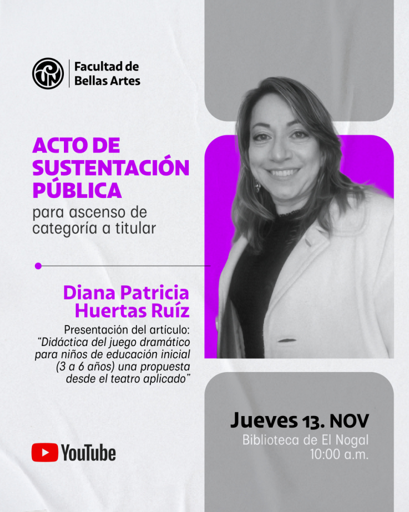 La Facultad de Bellas Artes de la Universidad Pedagógica Nacional (UPN) invita a la comunidad universitaria al acto de sustentación pública para el ascenso de categoría a titular de la docente Diana Patricia Huertas Ruiz.