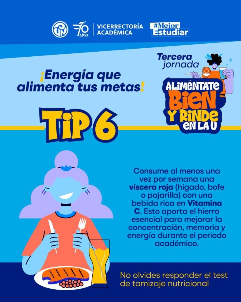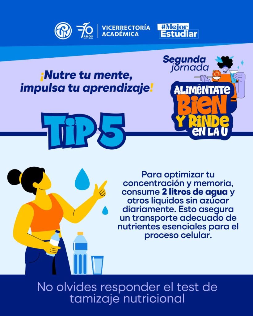 Como parte de la estrategia «Aliméntate bien y rinde a la U» de la Universidad Pedagógica Nacional compartimos con toda la comunidad algunos tips para nutrir la mente e impulsar el aprendizaje.
