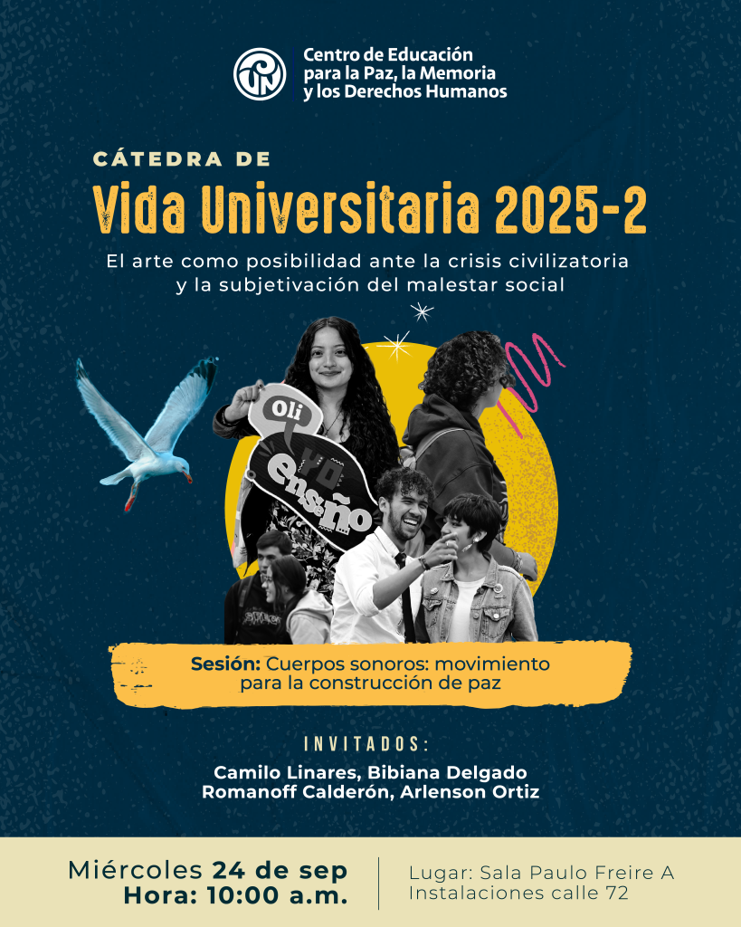 El Centro de Educación para la Paz, la Memoria y los Derechos Humanos, a través de la Cátedra de Vida Universitaria, continúa con su ciclo de sesiones «El arte como posibilidad ante la crisis civilizatoria y la subjetivación del malestar social». La próxima cita, titulada «Cuerpos sonoros: movimiento para la construcción de paz», se llevará a cabo este miércoles 24 de septiembre a las 10:00 a.m.