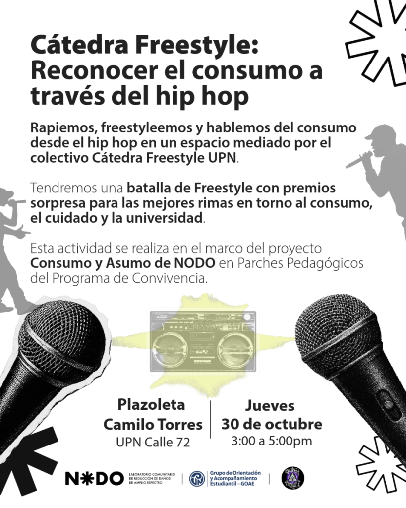 Durante la jornada, los asistentes podrán rapear, freestylear y conversar sobre el consumo en un ambiente creativo y colaborativo, mediado por el colectivo Cátedra Freestyle UPN. Además, se llevará a cabo una batalla de freestyle con premios sorpresa para las mejores rimas relacionadas con el consumo, el cuidado y la vida universitaria.