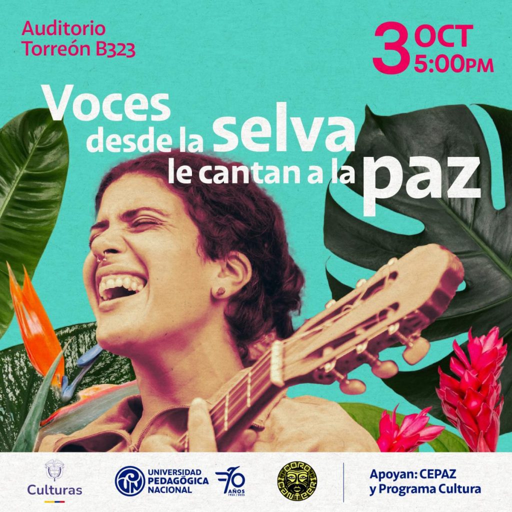 El Centro de Educación para la Paz, la Memoria y los Derechos Humanos y el Programa de Cultura de la Universidad Pedagógica Nacional, invitan a la comunidad al concierto «Voces desde la Selva le cantan a la Paz», que se realizará en el auditorio Torreón B323, desde las 5:00 p.m. del día 3 de octubre.