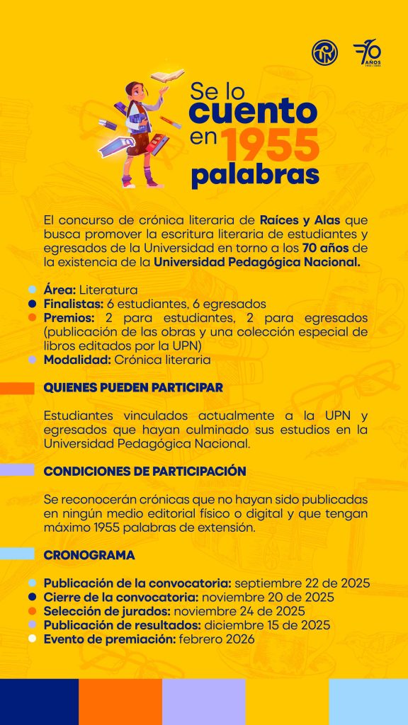 El Concurso de Crónica Literaria: Se lo cuento en 1955 palabras, impulsado por el proyecto Raíces y Alas y la Biblioteca de la UPN, busca promover la escritura literaria de estudiantes y egresados de la Universidad Pedagógica Nacional en torno a los 70 años de existencia de nuestra alma mater (para mayor información consulte los términos de la convocatoria).