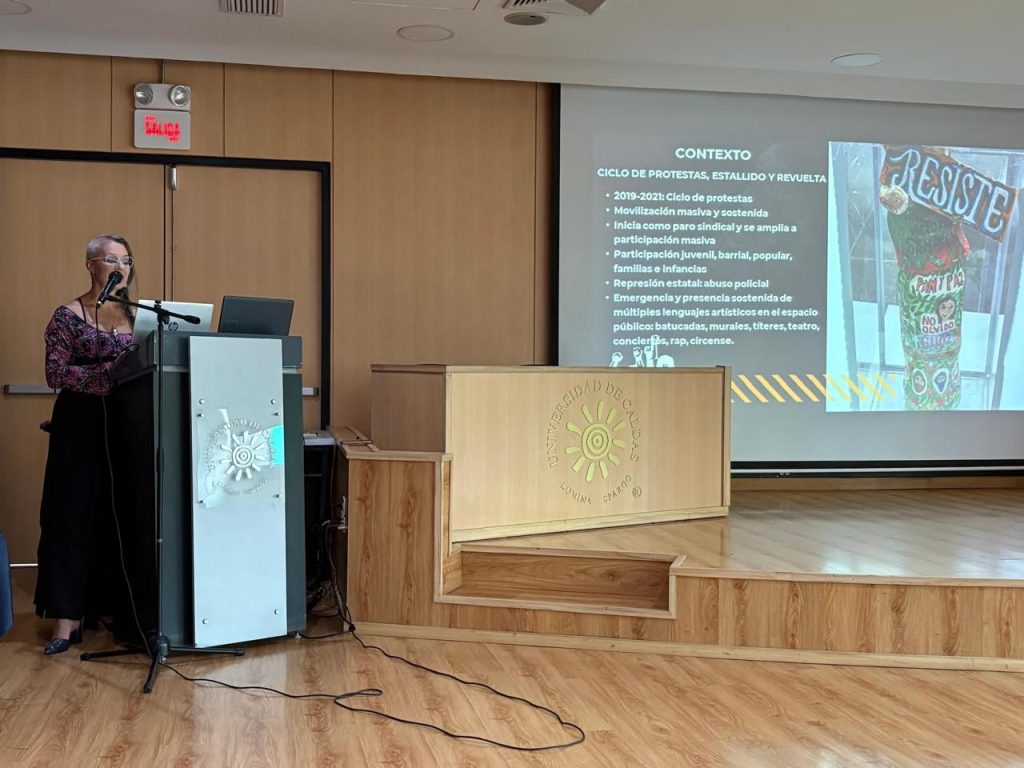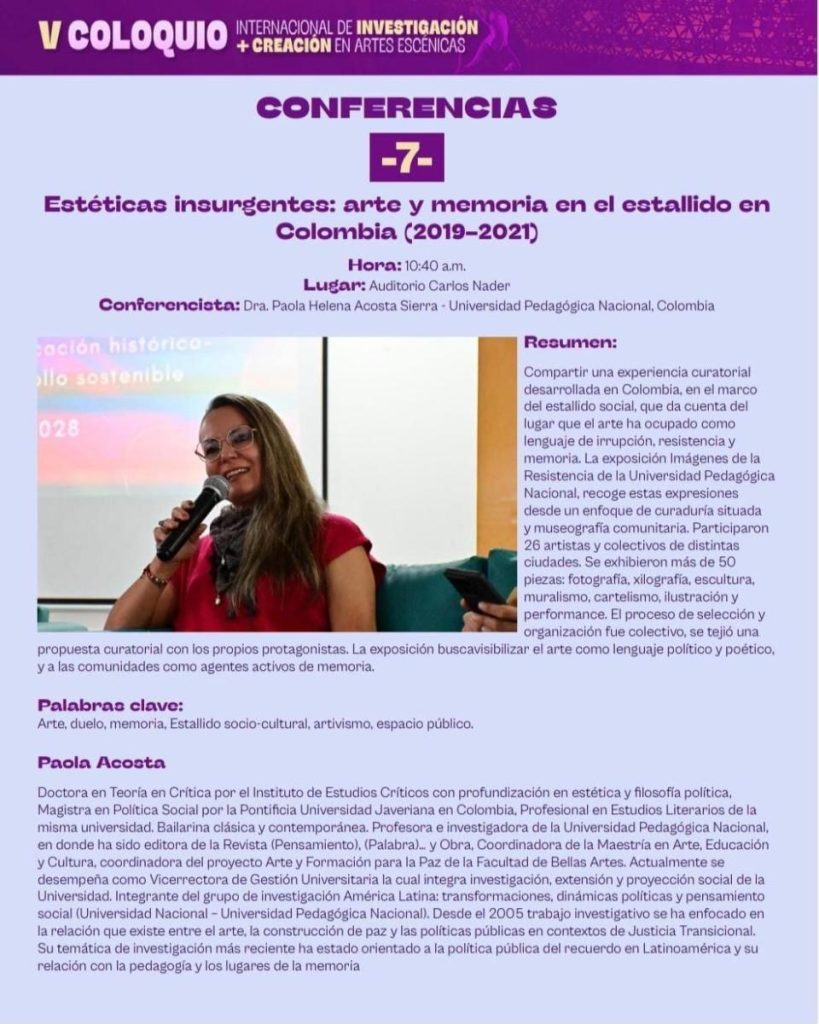 En el V Coloquio Internacional de Investigación + Creación en Artes Escénicas, la Universidad Pedagógica Nacional presentó la conferencia “Estéticas insurgentes: arte y memoria en el estallido en Colombia (2019–2021)”, centrada en la experiencia curatorial Imágenes de la Resistencia.