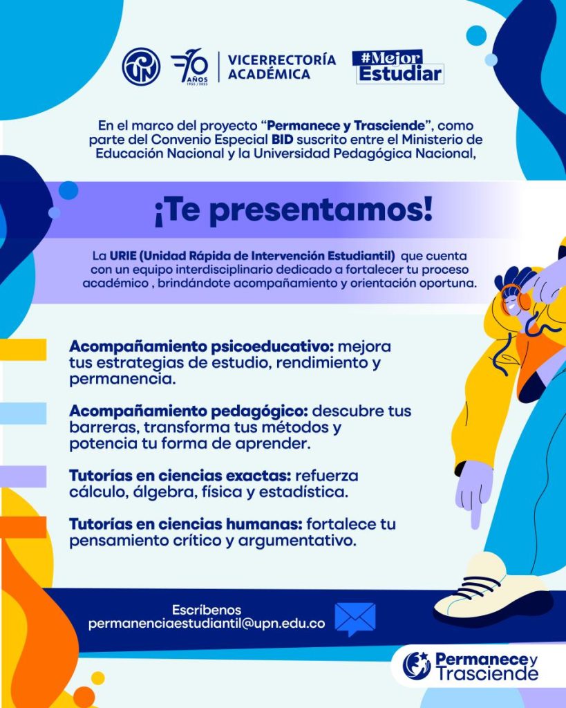 En el marco del proyecto “Permanece y Trasciende”, desarrollado como parte del Convenio Especial BID suscrito entre el Ministerio de Educación Nacional y la Universidad Pedagógica Nacional (UPN), la Vicerrectoría Académica presenta la Unidad Rápida de Intervención Estudiantil (URIE).