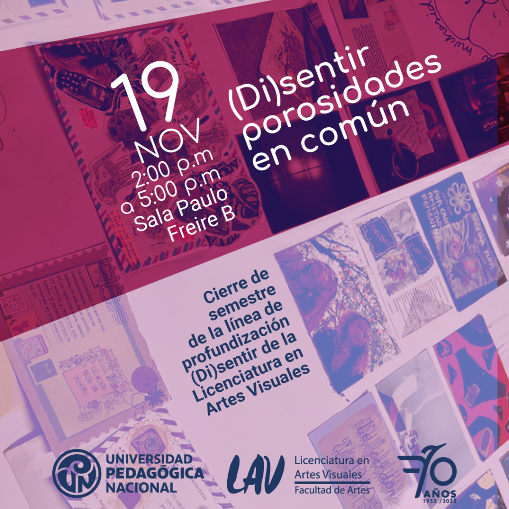 La Licenciatura en Artes Visuales de la Universidad Pedagógica Nacional invita a la comunidad universitaria y al público general al cierre de semestre de la línea de profundización (Di)sentir, un espacio académico y creativo que explora las sensibilidades, los afectos y las prácticas artísticas como formas de pensamiento crítico y creación colectiva.
