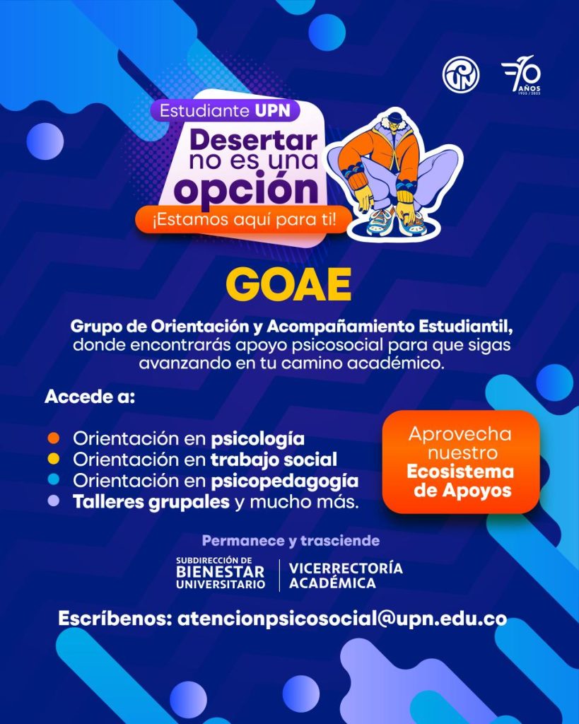 El GOAE, adscrito a la Subdirección de Bienestar Universitario y la Vicerrectoría Académica, ofrece orientación en psicología, trabajo social y psicopedagogía, además de talleres grupales y diversas estrategias diseñadas para fortalecer el bienestar y la permanencia estudiantil.