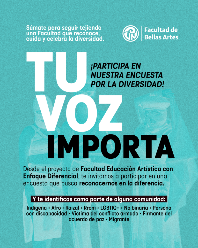 Esta información será clave para la Facultad de Artes. Buscamos identificar potencias, experiencias, retos y barreras que tenemos como comunidad y así, fortalecer las estrategias de inclusión, permanencia, bienestar, accesibilidad y justicia social de la Facultad, con enfoque interseccional.