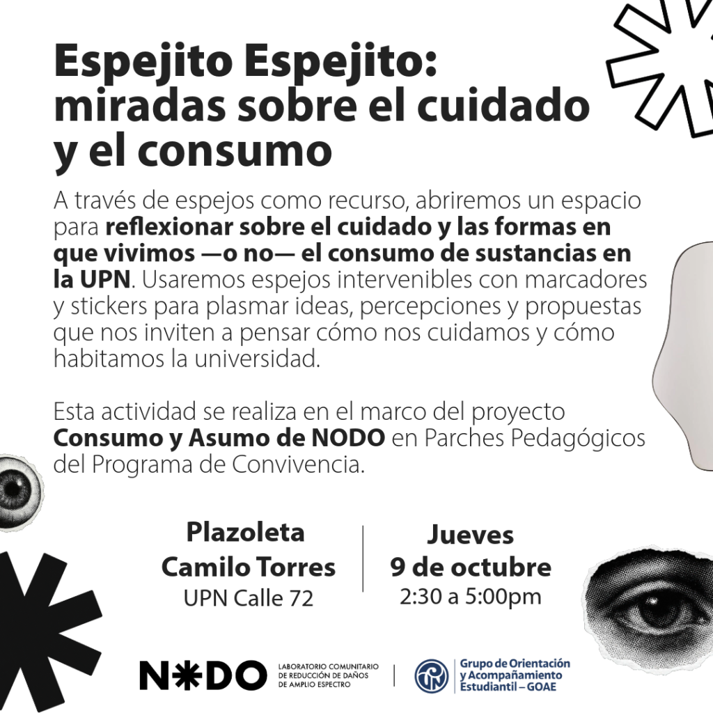 la UPN. Usaremos espejos intervenibles con marcadores y stickers para plasmar ideas, percepciones y propuestas que nos inviten a pensar cómo nos cuidamos y cómo habitamos la Universidad.
