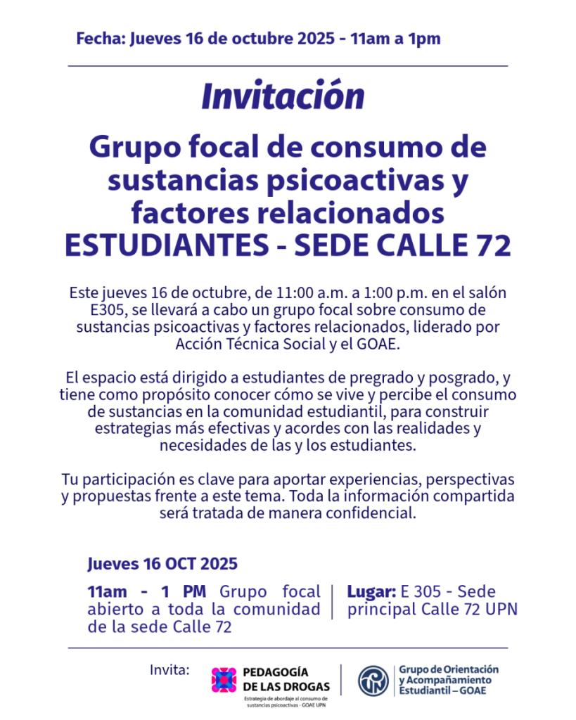 Este jueves 16 de octubre, de 11:00 a.m. a 1:00 p.m., en el salón E305, se llevará a cabo un grupo focal sobre consumo de sustancias psicoactivas y factores relacionados, liderado por Acción Técnica Social y el GOAE.