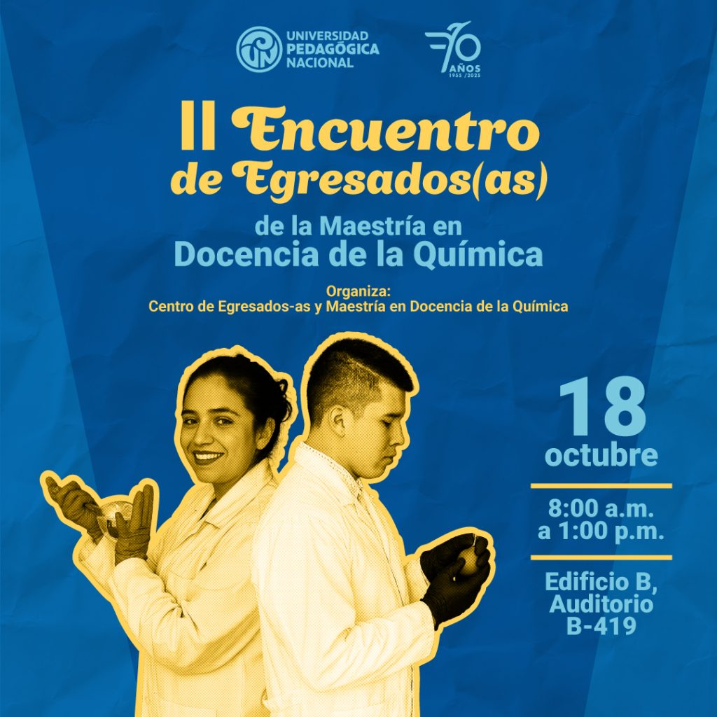 El Centro de Egresados-as y la Maestría en Docencia de la Química invitan al II Encuentro de Egresados (as) de la Maestría en Docencia de la Química que se realizará el 18 de octubre de 2025 de 8:00 a.m. a 1:00 p.m. en el Edificio B, Auditorio B- 419.