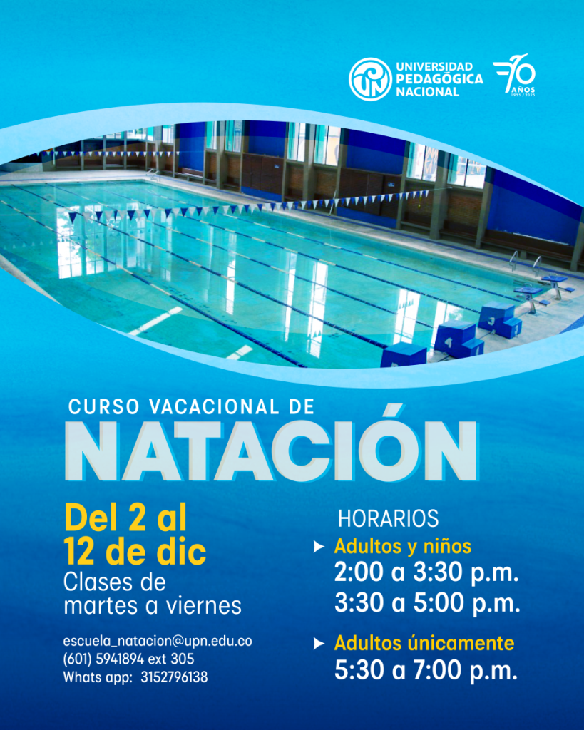 La Universidad Pedagógica Nacional invita a la comunidad universitaria y al público en general a participar en el Curso Vacacional de Natación, que se realizará del 2 al 12 de diciembre, con clases programadas de martes a viernes.