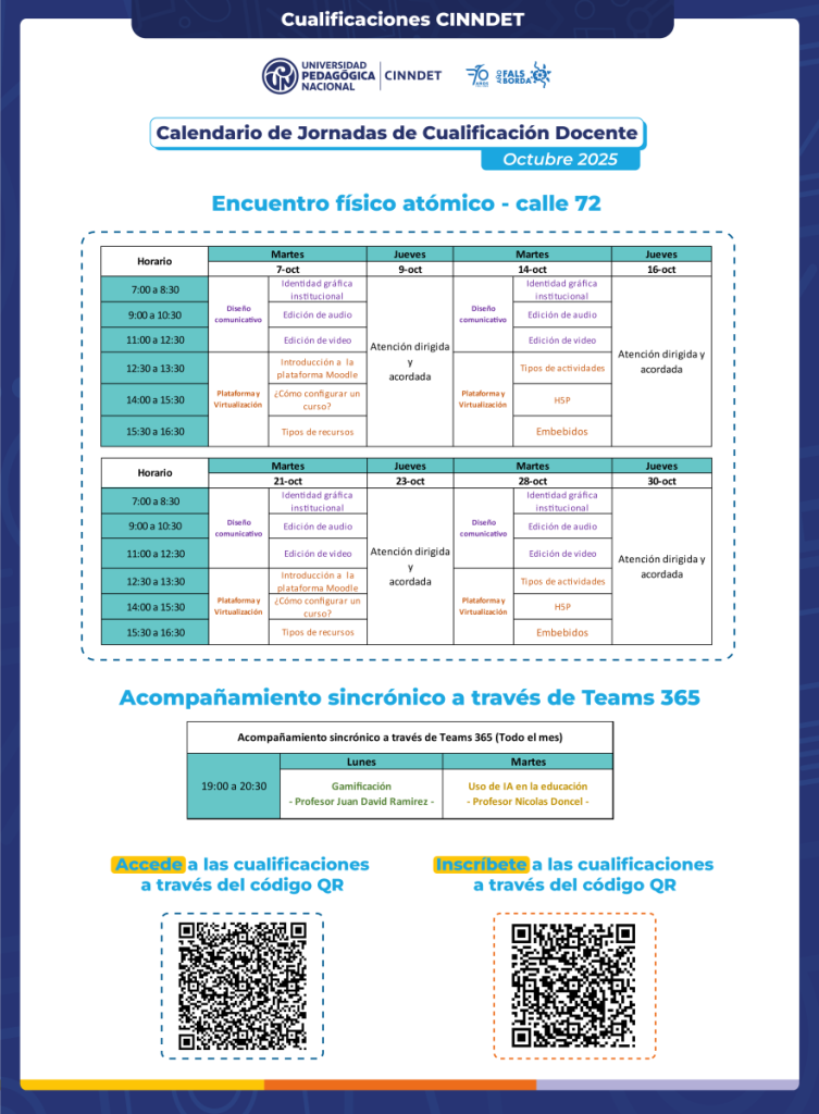 El Centro de Innovación y Desarrollo Tecnológico (CINNDET) invita cordialmente a toda la planta docente a participar en las jornadas de cualificación que se realizarán durante el mes de Octubre de 2025, como parte de nuestro compromiso institucional con el fortalecimiento de nuestros saberes y prácticas académicas.