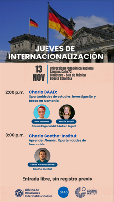 La Universidad Pedagógica Nacional (UPN), a través de la Oficina de Relaciones Interinstitucionales (ORI), te invita a participar en una nueva sesión de los Jueves de Internacionalización, con la presencia del Servicio Alemán de Intercambio Académico (DAAD) y el Goethe-Institut.