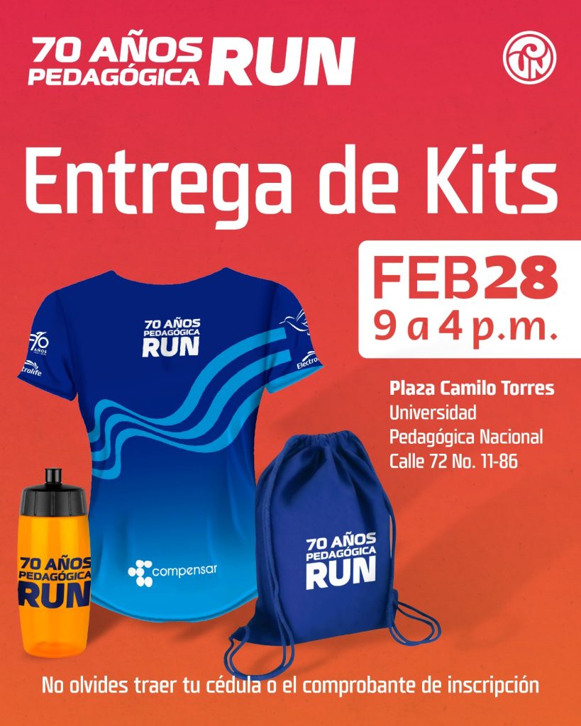 La entrega de los kits para las y los corredores se realizará el día 28 de febrero de 9:00 a.m. a 4:00  p.m. en la Plaza Camilo Torres de la UPN, presentando la cédula o el comprobante de inscripción.