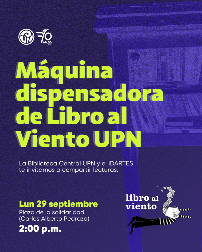 La Biblioteca Central convoca a toda la comunidad a la activación de las máquinas dispensadoras Libro al Viento que se llevará a cabo en Plaza de la solidaridad (Carlos Alberto Pedraza) frente al edificio A, el lunes 29 de septiembre de 2025 a las 2:00 p.m.