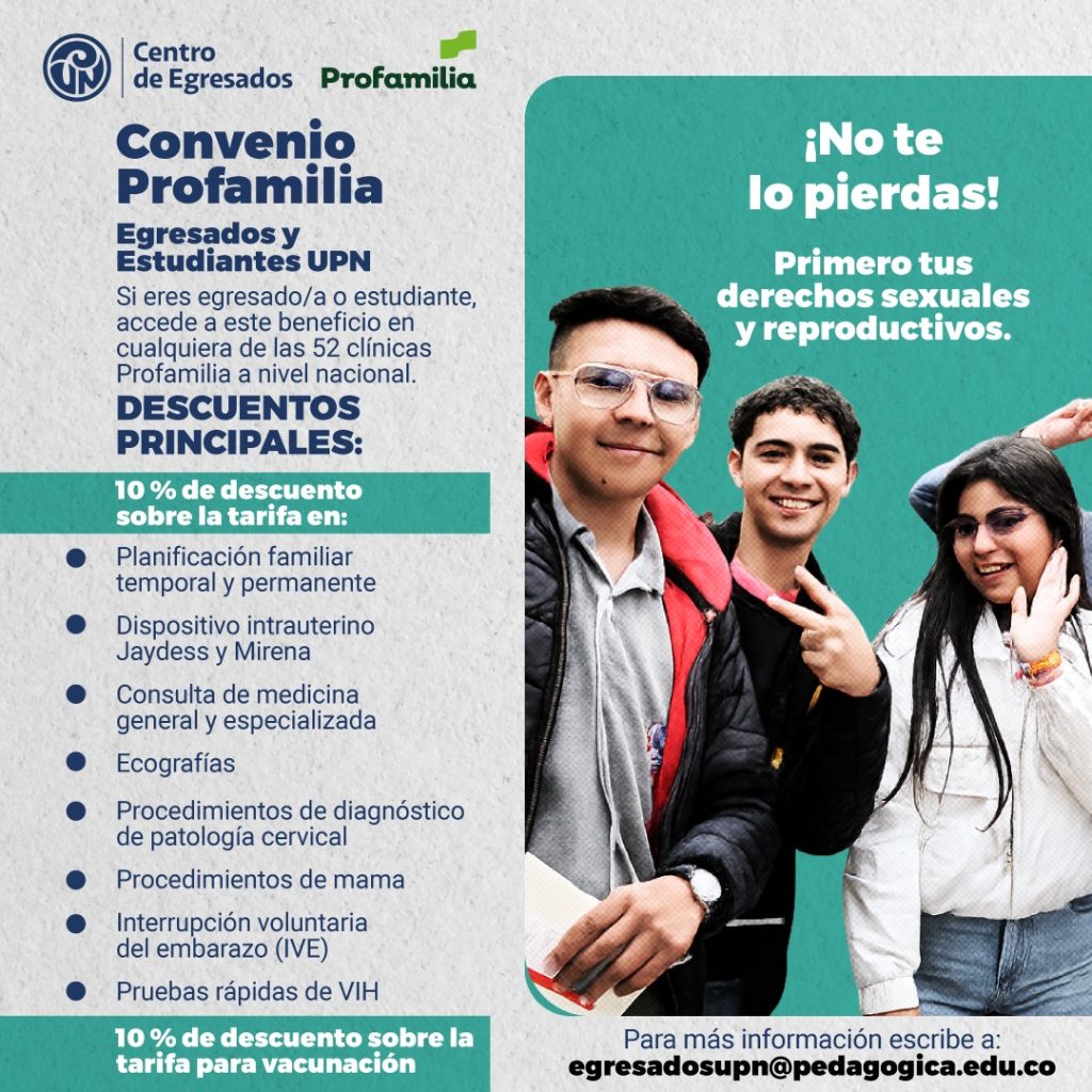 El Centro de Egresados de la Universidad Pedagógica Nacional anuncia con orgullo el Convenio Profamilia, una alianza que busca promover el acceso a servicios de salud sexual y reproductiva para toda la comunidad pedagógica.