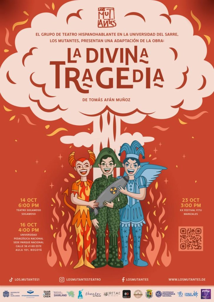 La Vicerrectoría de Gestión Universitaria informa que la compañía de teatro Los Mutantes presentará su obra Divina Tragedia el jueves 16 de octubre de 2025 a las 4:00 p.m. en la Sede Parque Nacional UPN – Calle 36 No. 1-6º Este, Bogotá.