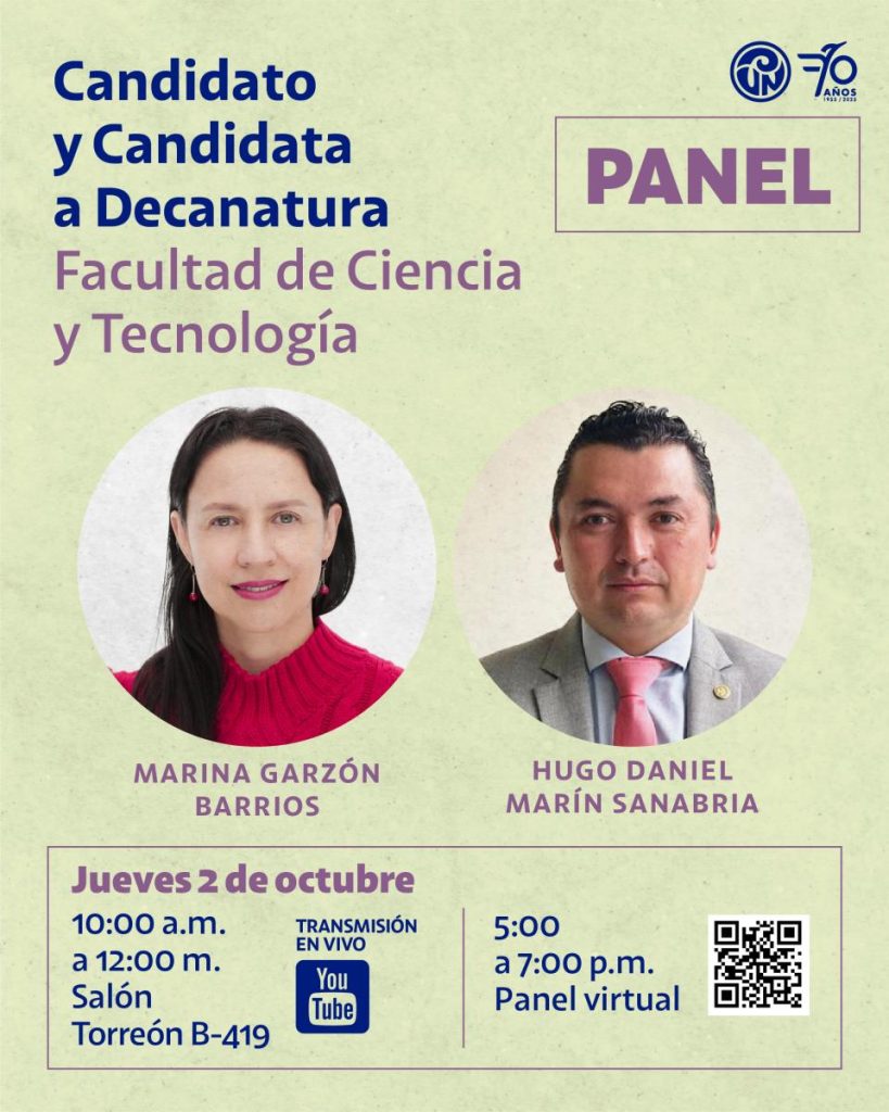 La Facultad de Ciencia y Tecnología de la Universidad Pedagógica Nacional (UPN) se complace en invitar a toda la comunidad universitaria (estudiantes, docentes, administrativos y egresados) al panel de candidaturas a la decanatura. Este evento tiene como objetivo central abrir un espacio de diálogo y reflexión donde podremos escuchar de primera mano los proyectos e ideas de los aspirantes.