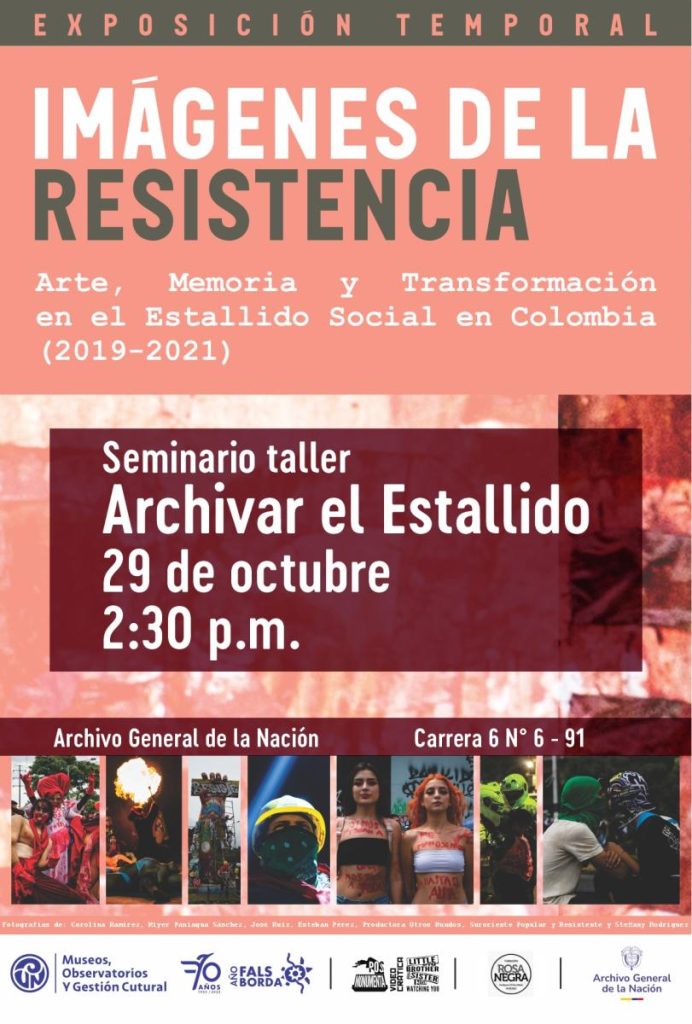 Este espacio busca fortalecer las prácticas de archivo comunitario y construir redes colaborativas para mantener vivas las memorias de resistencia. Además será el cierre de la itinerancia de la Exposición Imágenes de la Resistencia: Arte, Memoria y Transformación en el Estallido Social en Colombia (2019-2021) en el Archivo General de La Nación.