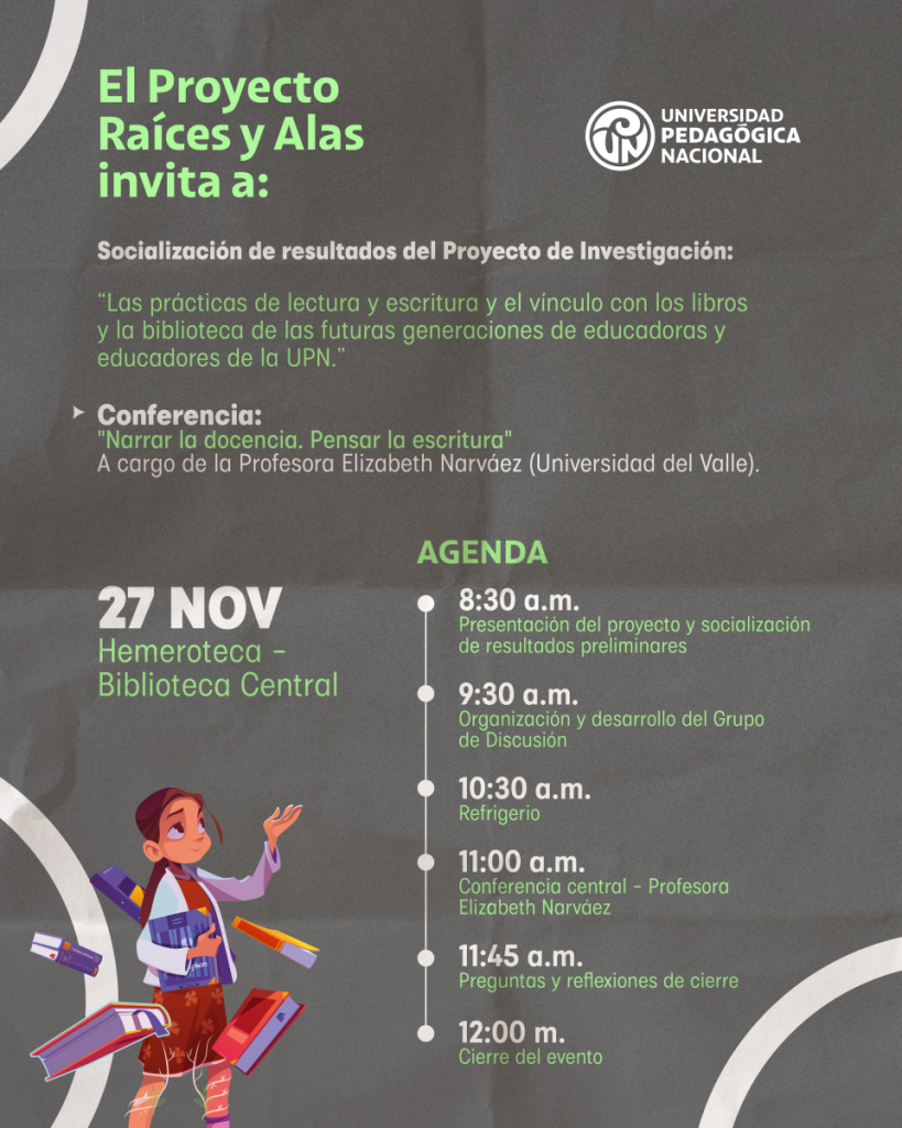 El Proyecto Raíces y Alas invita a la socialización de resultados del proyecto de Investigación «Las prácticas de lectura y escritura y el vínculo con los libros y la biblioteca, de las futuras generaciones de educadoras y educadores de la UPN.” y a la conferencia: Narrar la docencia: pensar la escritura. Filtrar lecciones aprendidas al trabajar por/con el “Lenguaje’ con la Profesora Elizabeth Narváez (Universidad del Valle).